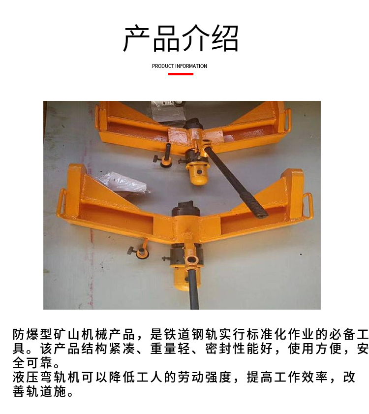 液压弯轨机又叫液压弯道机,是铁路安装养护时对钢轨进行弯曲作业的一种专用工具。该机具专门用于矿山斜井铺设铁道线路遇到坑道水平标高改变时在铺轨现场对24kg/m即以下轻型钢轨实施垂直方向的弯曲或调整。
