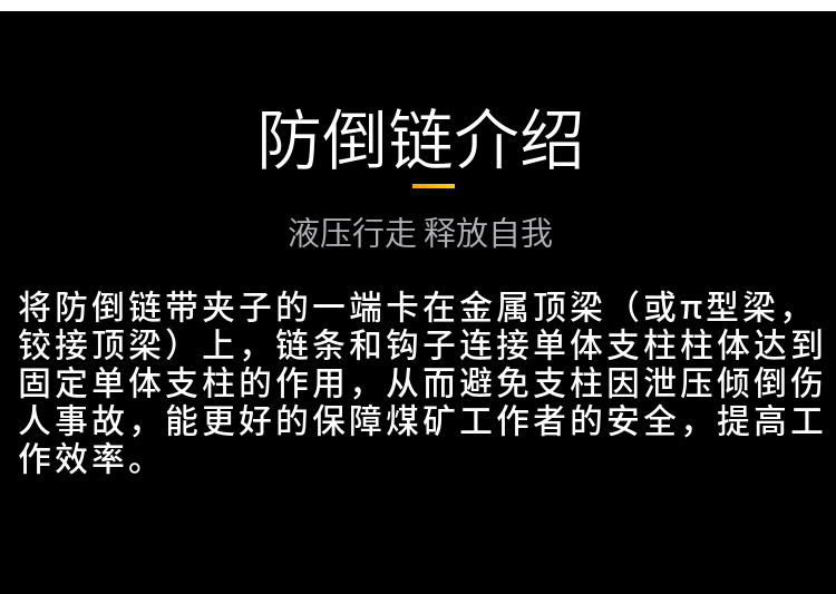 将防倒链带夹子的一端卡在金属顶梁(或π型梁,铰接顶梁)上,链条和钩子连接单体支柱柱体达到固定单体支柱的作用,从而避免支柱因泄压倾倒伤人事故,能更好的保障煤矿工作者的安全,提高工作效率。