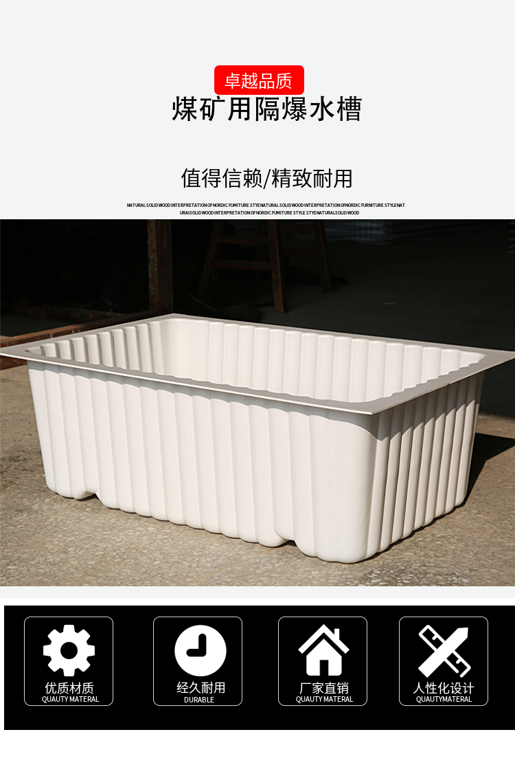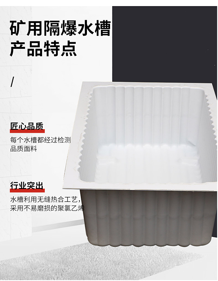 隔爆水槽具有阻燃、抗静电、承载力好、不渗漏、便于安装之功能,是煤矿井下有效阻止可燃气体、煤尘爆炸传播的可靠产品.规格齐全.有30L、40L、50L、60L、80 L等国标水袋水槽,规格齐全!