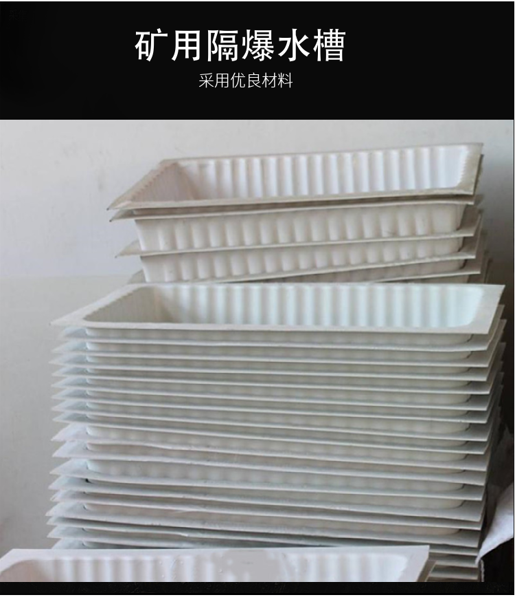 隔爆水槽具有阻燃、抗静电、承载力好、不渗漏、便于安装之功能,是煤矿井下有效阻止可燃气体、煤尘爆炸传播的可靠产品.规格齐全.有30L、40L、50L、60L、80 L等国标水袋水槽,规格齐全!