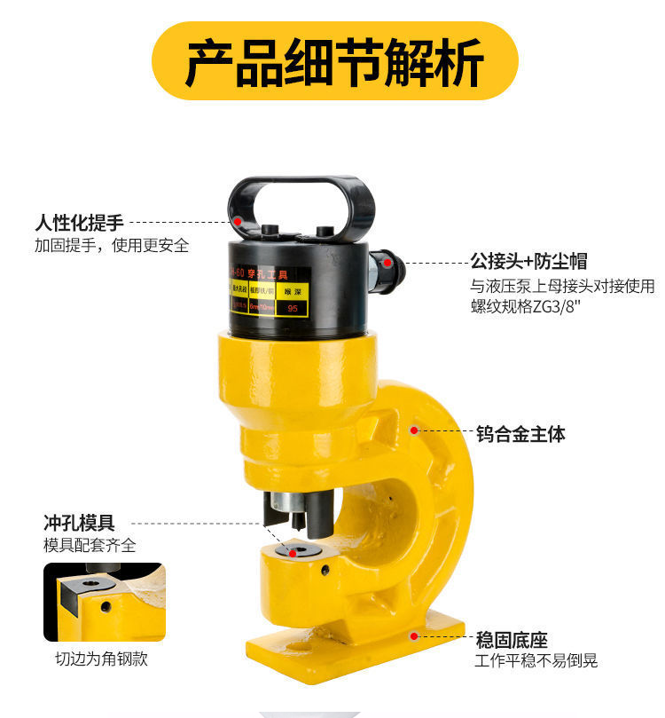 角钢冲孔机是用于开关柜、配电盘、配线工程安装中铜排,铝排,铁板等金属材料的液压冲孔工具。由手动泵或电动泵和工作头二部分组成,输油软管采用快速接头连接,密封可靠。快速作业时无方向性限制。多种规格模具可定做,随机配模具4付,CH-75液压冲孔机主受力头选用高强度合金钢制造,重量轻、携带方便,冲一次孔仅需20-30秒。
