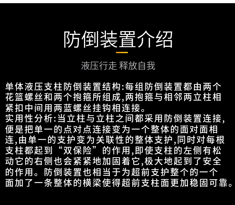 煤矿井下时常发生单体液压支柱因泄压或其他原因引起的支柱卸载歪倒事件,现有技术中,工作面单体支柱防倒装置普遍采用防倒链、尼龙绳捆扎柱头,操作麻烦,紧固性差,安全系数小,支柱一旦歪倒,有滑动造成伤人事故的发生,起不到有效的防倒效果,无法满足矿井安全生产需要。为克服现有技术之缺陷,本实用新型之目的就是提供一种单体液压支柱连锁防倒装置,可有效解决现有煤矿用液压支柱使用麻烦、使用效果不好而存在的安全隐患。