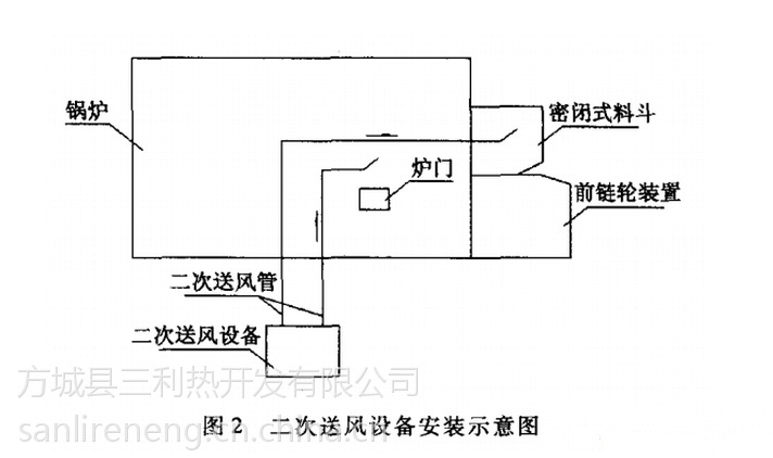 (5)在锅炉侧部安装1套二次送风设备及二次送风管。二次送风管一根通向锅炉炉膛,一根通向密闭式料斗,以保证燃料燃烧所需足够的氧气,达到完全燃烧的目的。二次送风设备安装如图2。