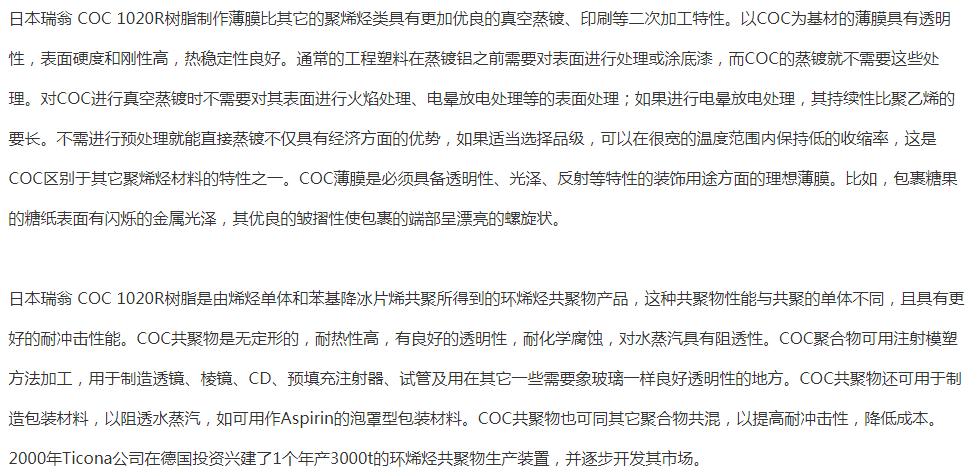 COC分子结构中含有坚硬的非极性的环状支链,这与一般的聚烯烃完全不同,正是由于这种分子结构赋予COC,具有非结晶性聚合物的高透明度、低双折射率、低吸湿性和低收缩率,同时赋予COC高耐热性、高硬度和高模量。它的主要应用领域的对手是聚碳酸酯(PC)和聚甲基丙烯酸甲酯(PMMA)。