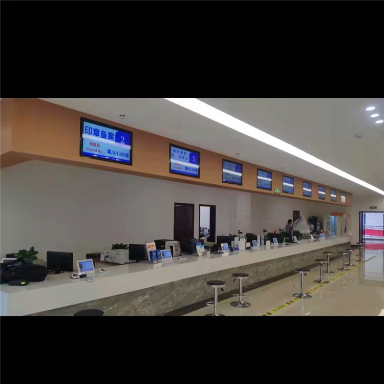 每个工位一块显示屏。界面自定义设置;显示本窗口的工作人员信息,闪烁显示叫号信息。播放单位的通知等宣传内容;