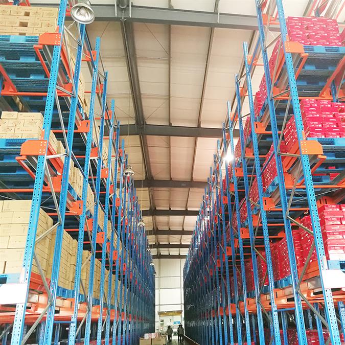 穿梭式货架的存货-----是由叉车将货物放在货架巷道导轨的前端,通过无线电操作济南建华制造穿梭车,穿梭车可以承载托盘货物在导轨上运行。