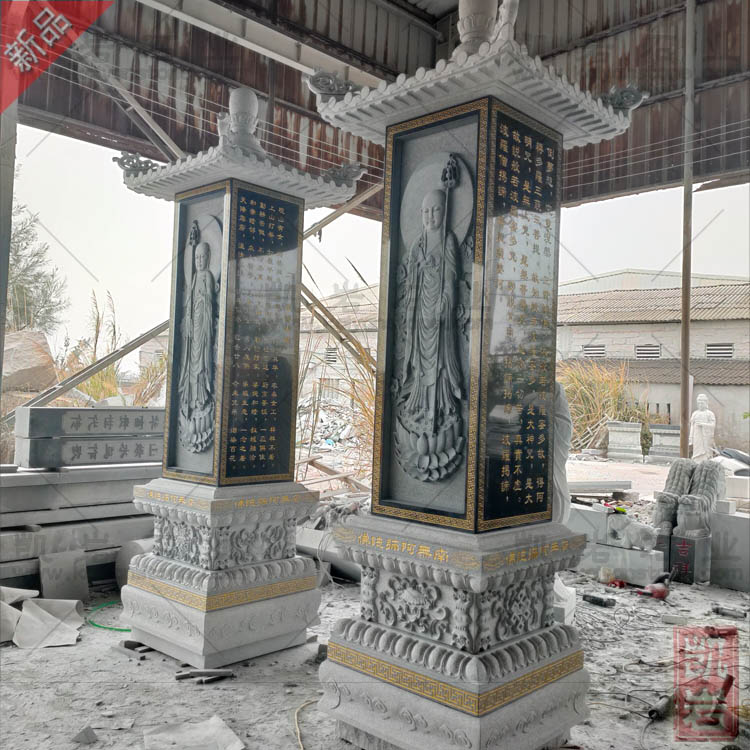 石经幢是我国佛教一种最重要的刻石。通常用多块石刻堆建而成。凿石为圆柱或棱柱,一般为八角形,高三四尺,上覆以盖,大于柱径,刻有垂幔、飘带等图案。下附台座。幢各面及底、头部,各刻佛或佛龛,在周幢雕像下,遍刻经咒,以《密经》及《尊胜陀罗尼》为最多。其制式由印度的幢形变化而来,白唐代永淳以后盛行各地。