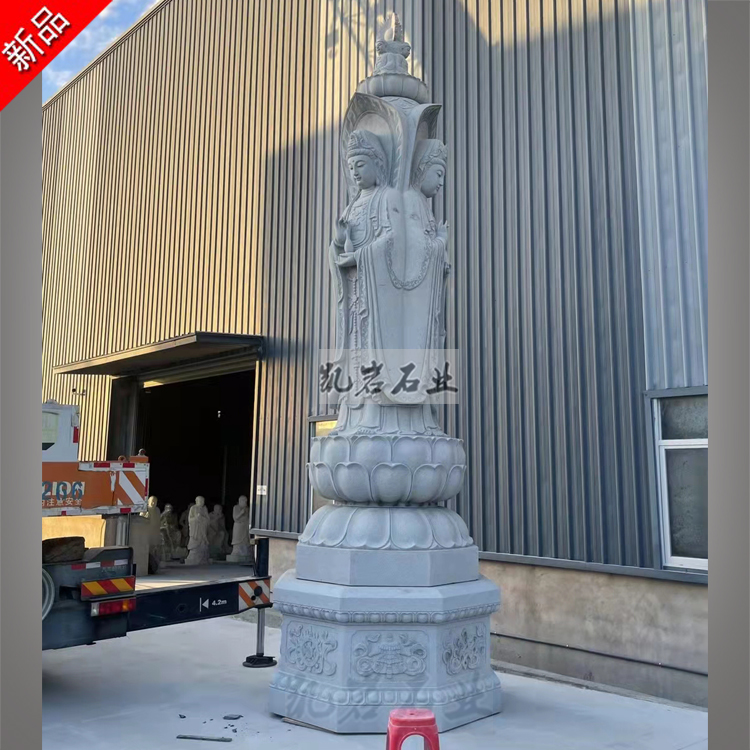 石雕三面观音佛像是比较多见的石雕佛像之一,石雕三面观音佛像我们在生活当中不常见,正面观音手持经箧,右面观音手持莲花,体现观音的法身德。左面观音手持念珠,体现观音的解脱德,即彻底摆脱无明烦恼和种种束缚,达到大自由大自在的境界,表现“众生念佛,佛念众生”同等同体的慈悲精神。依次象征智慧、平安、仁慈。每一尊法相蕴含一种大智能及感应功能、能增福添慧、保佑平安。另外,也有一些三面观音菩萨像的做法是由送子观音、送财观音、滴水观音组成的。