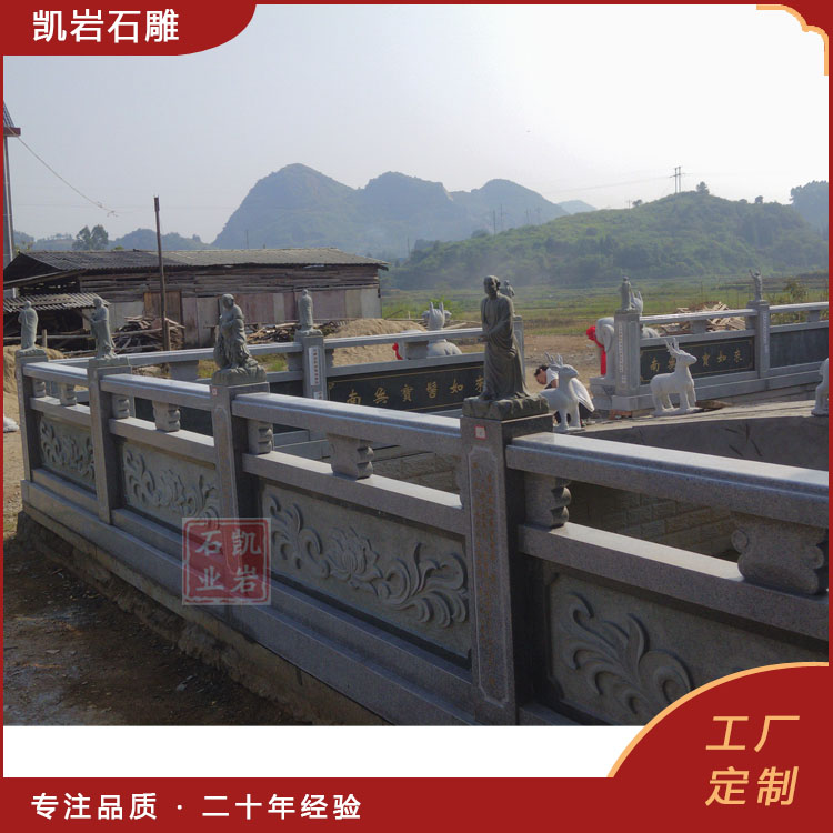 石材栏杆在景观园林中有较强的感染力,可雕刻出各种各样古典风格款式的图案设计。石雕栏杆的构成,有立柱,扶手,花托,栏板,地托,地铺石组成。立柱有浮雕图案云彩头、龙头、莲花等。栏板为主要表达形式,大部分都是一公分的浮雕图案,图案设计有梅兰菊竹四君子图案设计、喜气民间吉祥图案、反映本地的人文历史故事图案设计和仿古式纹雕刻,这样即能起到美化桥梁空间和周围环境,又能丰富人们的生活,陶冶人的情操,给人以美的享受。