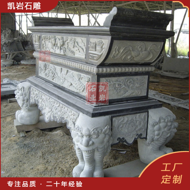 石雕供桌是一些大型*祀活动中常见的,用于在寺庙、祠堂、住宅等场所放置祠堂牌位,也是放置香烛和贡品的器具。无论放在哪里,都有着重要的地位,它的存在对于石雕香炉来说是不可或缺的。