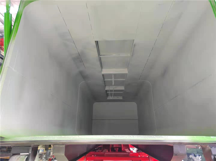 4、箱体后尾部可液压全部打开,可满足固态污泥的卸料要求,箱体法兰上安装有密封条及手动锁紧,可杜绝运输过程的撒漏现象;