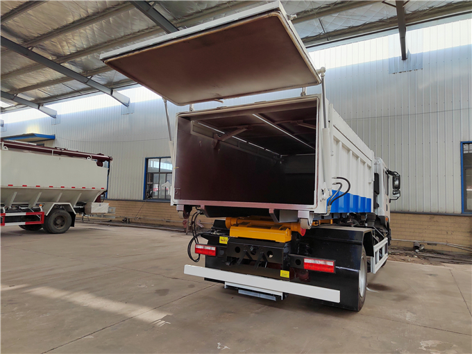 车厢可卸式运输污泥车-环卫垃圾车,箱体液压油缸举升卸料,后盖液压油缸开启和锁紧(卸料口耐腐蚀硅胶密封条密封),顶盖翼展两侧开启。箱式污泥运输车对接装载方式适合装载机装载、人工装载等多种方式。