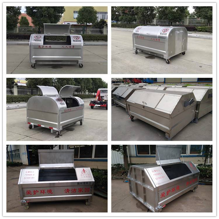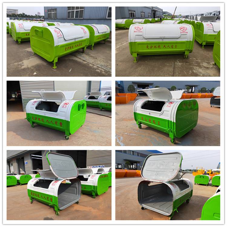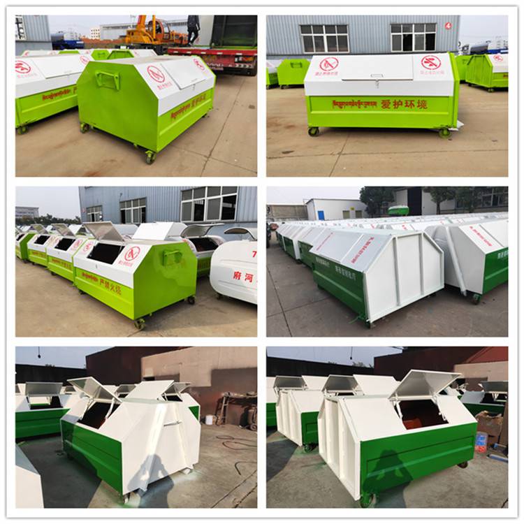 移动粪污垃圾箱和勾臂粪污垃圾车可完全分离,一辆车可维持多个垃圾箱循环收运。移动垃圾箱大小容积可根据用户实际需求定制。垃圾箱常用外形以上梯形下长方形、上弧形下长方形、上弧形下弧形、长方形为主,箱体两边各带一对或二对垃圾投入口或顶部开口,带盖式箱体能够避免风将轻质垃圾(塑料袋,废纸等)吹散和防止雨水进入箱内;箱体底部带一对铁轮方便吊上卸下时垃圾箱的移动,箱体后部可选液压开启【带锁紧机构,配备密封条】。