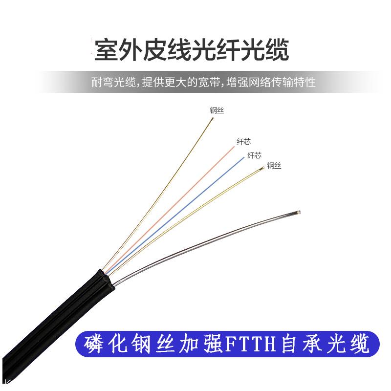 本店所出售的皮线光缆种类繁多,主要有1芯(指内置有1根光纤)、2芯(指内置有2根光纤)、白色(指外皮颜色为白色)、黑色(指外皮颜色为黑色)、FRP加强芯(指两侧加强芯是非金属材料所制)、金属加强芯(指两侧加强芯为金属钢丝加强芯)、自承式(通常指室外用的皮线光缆,其外部加多一根自承式架空用的钢丝)、非自承式(通常指室内用的皮线光缆),皮线光缆内光纤采用G.657小弯曲半径光纤,可以以20mm的弯曲半径敷设,适合在楼内以管道方式或布明线方式入户。