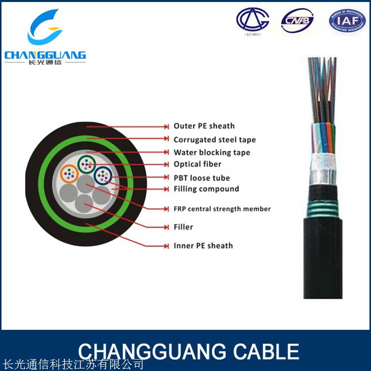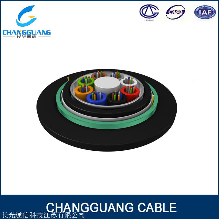 MGTS 光缆的结构是将 250um 光纤套入高模量材料制成的松套管中,松套管内填充防水化合物。缆芯的中心是一根金属加强芯,对于某些芯数的光缆来说,金属加强芯外还需挤上 一层聚乙烯(PE)。松套管(和填充绳)围绕中心加强芯绞合成紧凑和圆形的缆芯,缆芯内的缝隙充以阻水填充物。双面涂塑钢带(PSP)纵包后挤制一层阻燃护套后再挤制一层PVC护套成缆。