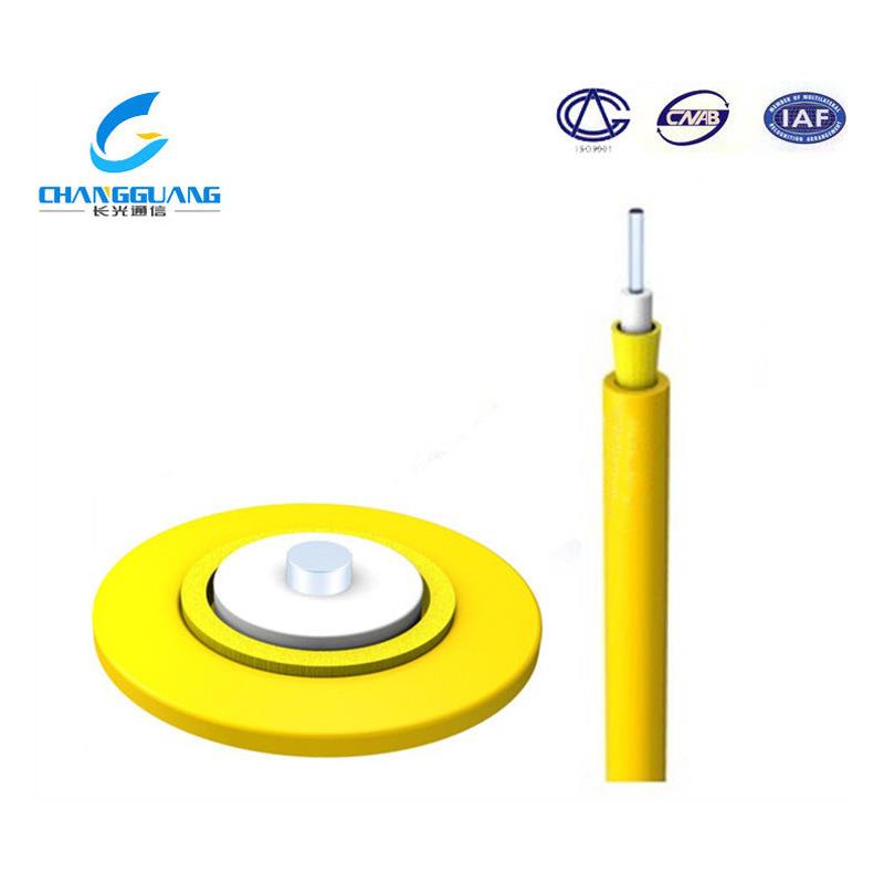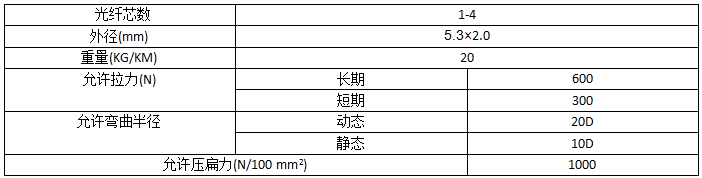 光缆中含1~4根有涂覆层的二氧化硅系光纤,其类别可以为ITU-T G.657A(C1)或G.652D(B1.3),同批产品应采用相同设计及相同材料和工艺制造出来的光纤,光纤应置于光缆的中心。光纤涂覆层可着色,着色层颜色应是符合GB 6995.2规定的蓝、橙、绿、棕、单纤为可为本色。用于成缆的单模光纤的涂覆层结构、光纤强度筛选水平、模场直径和尺寸参数、截止波长和弯曲损耗应符合下文表1、2、3中的规定。光缆中的加强构件可为高强度不锈钢钢丝或磷化钢丝的金属加强构件,也可为聚酯芳纶丝或其它合适的纤维束的非金属加强构件,应具有足够的杨氏模量和弹性应变范围。光缆的加强构件应为2根,平行对称于光缆中.侧面一个粗钢丝吊线。