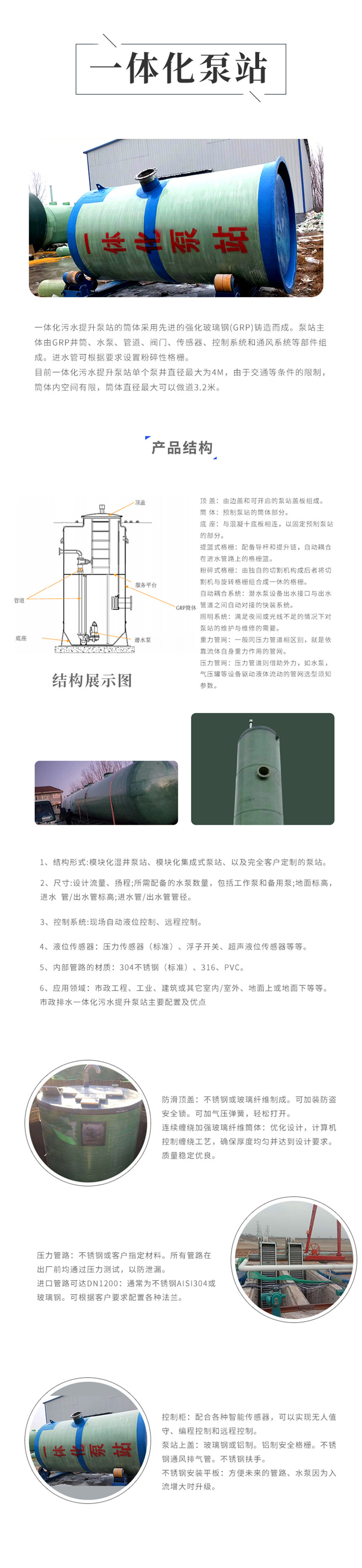 预制泵站 预制泵站设计特征1、预制泵站体积小,但可利用有效容积优良;集成化程度高,真正的一体化;2、筒体采用先进的耐腐蚀材质强化玻璃钢机械缠绕成形或内衬特种钢外覆玻璃钢;3、泵坑采用CFD流体学设计,具有流态好、无堵塞,自清洁功能;4、预制泵站质量可靠,无渗漏,不会污染环境;重量轻,造价较低;5、预制泵站配备高质量、高性能的潜水排污泵,其广泛应用传感器时刻监控水泵运行状况,大大降低了维护费用;6、自动化集成度高,可实现异地监控与管理,同时可以实现远程数据无限传送和自动生成运行报表等功能;7、预制泵站使用安全:其科学的设计与配置大大减少了剧毒及恶臭气体产生,保护了环境;