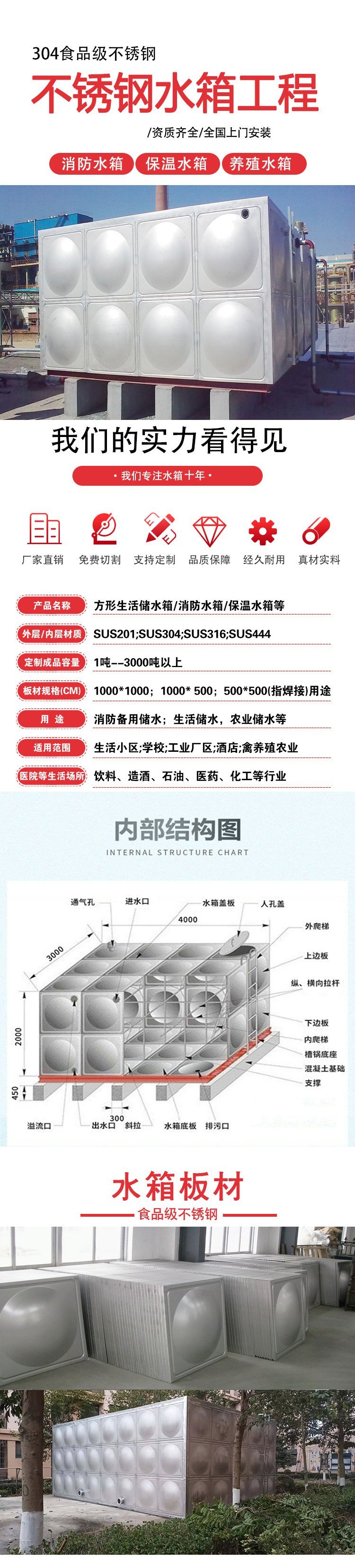 焊接式不锈钢水箱具有重量轻、不锈蚀、不渗漏、无毒性、水质好、使用范围广、使用寿命长、外形美观、安装方便、清洗维修简便、适应性强等特点。不锈钢水箱优点具有重量轻,不锈蚀,不渗漏水质好,寿命长,环保健康,外形美观,安装方便,清洗维修简便,使用广泛等特点。该保温水箱是以不锈钢板、彩钢板等为表层,闭孔阻燃自熄型聚苯乙烯料板或聚氨酯等为芯层,通过优化组合,使内外层共同达到保温效果,该水箱具有外形美观,机械强度高,性能优良,组装方便等优越特点。
