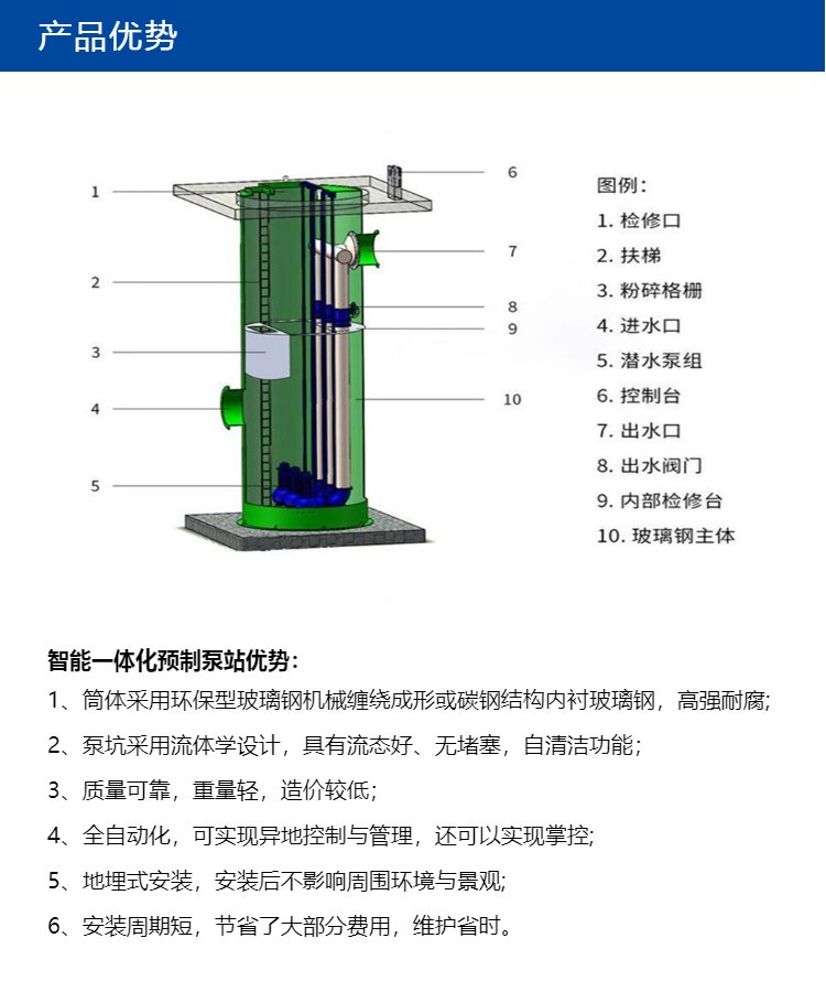 一体化污水泵站是由顶盖、玻璃钢筒体、潜水泵、服务平台、管道、电气控制和通风系统等部件构成的一套完整的成套设备,并在出厂前安装,其功能是收集雨水,然后进行下一步,使其达到国家排放标准。一体化污水泵站的监控工具,可以采用电脑或手机,实时监控,随时了解泵站运行状况,同时对所有数据进行快速集中。