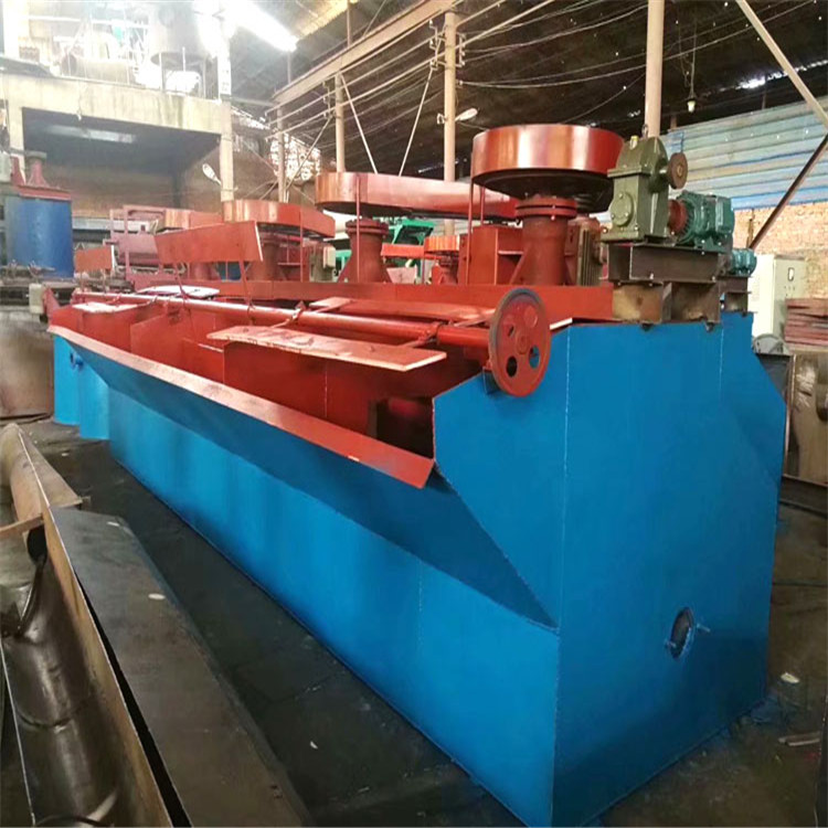 浮选机是实现浮选过程的重要装置。矿石经过湿式磨矿后,已基本单体解离的矿物被调成一定浓度的矿浆,在搅拌槽内与浮选药剂充分调和后送入浮选机,浮选机(矿用浮选机)由电动机三角代传动带动叶轮旋转,产生离心作用形成负压,一方面吸入充足的空气与矿浆混合,一方面搅拌矿浆与药物混合,同时细化泡沫,使矿物粘合泡沫之上,在其中通过充气与搅拌,使欲选的目的矿物向气泡附着,在矿浆面上形成矿化泡沫层,用刮板刮出或以自溢出,即成为泡沫产品(精矿),调节闸板高度,控制液面,使有用泡沫被刮板刮出。而非泡沫产品自槽底排出。该选矿设备性能是影响浮选技术的一个重要因素。机械搅拌式浮选机结构合理,