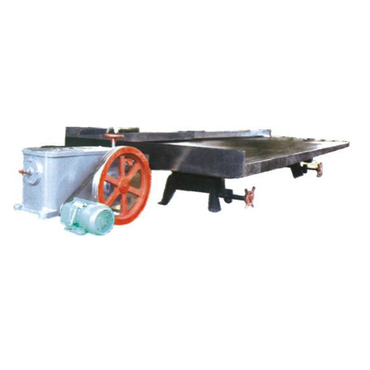 典型的摇床结构。摇床的床面近似呈矩形或菱形。在床面纵向的一端设置传动装置。床面的横向有较明显的倾斜,在倾斜的上方布置给矿槽和冲水槽。床面沿纵向布置有床条(俗称来复条)。整个床面由机架支撑或吊起。