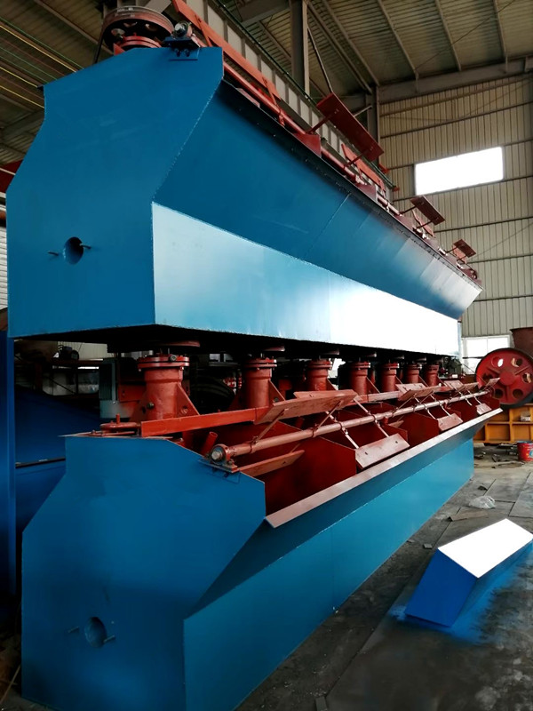 浮选机是实现浮选过程的重要装置。矿石经过湿式磨矿后,已基本单体解离的矿物被调成一定浓度的矿浆,在搅拌槽内与浮选药剂充分调和后送入浮选机,浮选机(矿用浮选机)由电动机三角代传动带动叶轮旋转,产生离心作用形成负压,一方面吸入充足的空气与矿浆混合,一方面搅拌矿浆与药物混合,同时细化泡沫,使矿物粘合泡沫之上,在其中通过充气与搅拌,使欲选的目的矿物向气泡附着,在矿浆面上形成矿化泡沫层,用刮板刮出或以自溢出,即成为泡沫产品(精矿),调节闸板高度,控制液面,使有用泡沫被刮板刮出。而非泡沫产品自槽底排出。该选矿设备性能是影响浮选技术的一个重要因素。