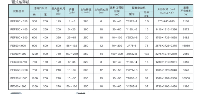 PE、PEX系列颚式破碎机为大型复摆式,广泛适用于矿山、冶炼、建筑、公路、铁路、水利和化学工业等众多行业,处理粒度大,抗压强度不超过320Mpa的各种矿石和岩石的粗碎或中碎作业。PE系列用于粗破,PEX系列用于中、细破。