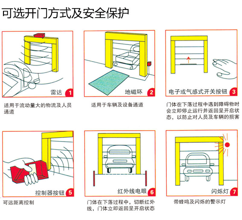手动按钮式 (基本配置)手动拉绳式(经济实用)式(可远距离控制)磁环式(适用于车辆及设备通道)雷达(适用于流动量大的物流及人员通道)双面光电(特殊物流通道)两扇门互锁、联锁(适用于高洁净度要求通道)