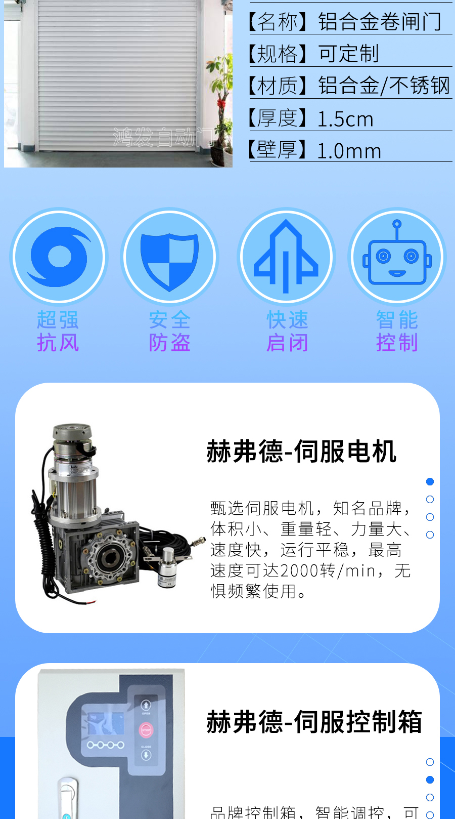 铝合金材门板规范厚度为门板宽100mm,厚1.5mm,壁厚为1.0mm,外表经过阳极氧化加有机着色处置,可选颜色。经过软衔接胶条将门板间停止密封,软衔接局部折叠寿命达百万次以上;门板之间不接触,长时间后还可坚持平整性,抗风才能32 m/s(国标抗风等级12级)。