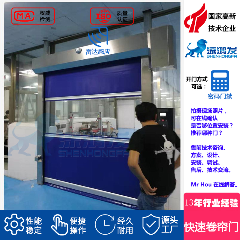 安全保护:门框两侧设有对射红外线,快速门下方有物体,使门保持开启状态