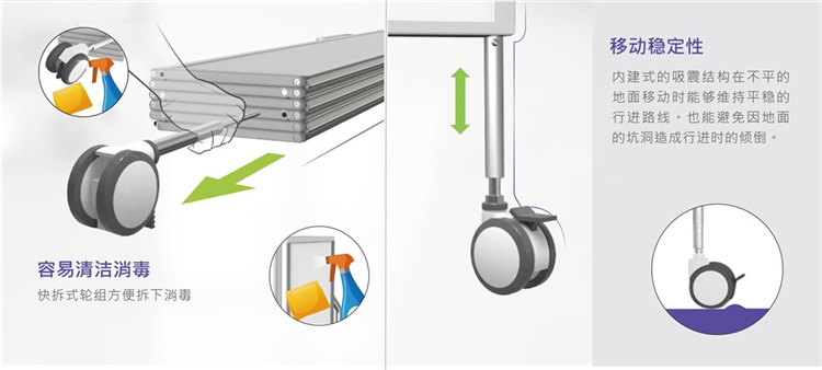 5.搭载双面静音脚轮,配备刹车功能,能供医疗人员良好的操控性,独特快拆式设计容易拆卸和重新安装;