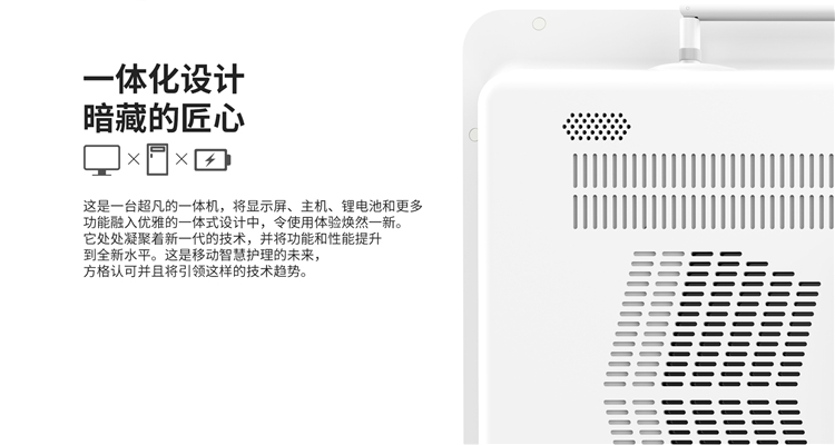 方格品牌FG-H-14一体机电脑将21.5英寸屏幕、工业主机、锂电池整合于一体机中,适合挂载于各式查房车和多功能护理车等医疗推车上使用。其坚固、一体型的设计能配合各种智慧护理应用,拥有无线联网功能,并可选电容式触屏,亦无需额外购买昂贵的医疗推车用电池,是医疗人士管理病患信息理想的解决方案。