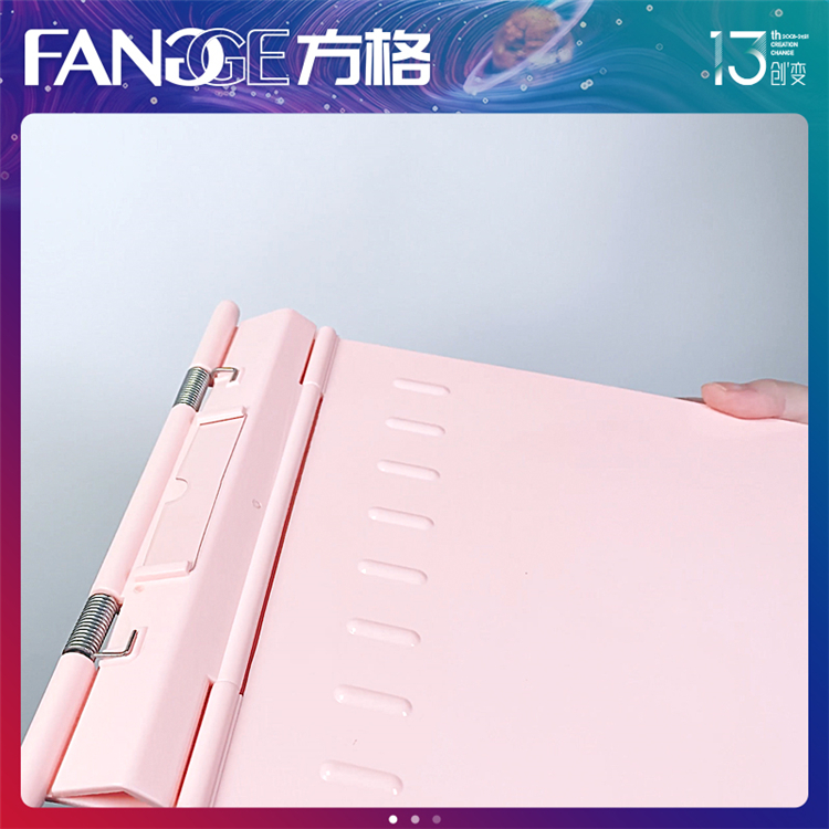 方格牌ABS病历夹材料上选用进口ABS工程塑料颗粒,强度高、韧性好、易于加工成型。加工出的产品表面光洁,易于染色。针对医疗环境的特点,我们设计出了多种功能性色彩供用户选择,整个产品重量达到了600克,高强度弹簧经过4.5万次反复疲劳式开合测试。
