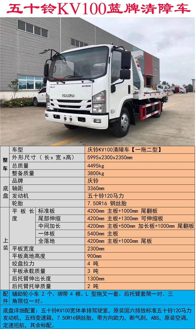 上装配置:2吨上装,4吨卷扬,20米钢丝绳,有三种板面可选,一体板3.8+1.3=5.1米左右,液压翻转板4.1+1=5.1米左右,液压伸缩板4.2+1.2=5.4米左右,宽2.3米,双侧联动操作,配喊话器一套.辅助小车一套,四根捆绑带,底盘合格证,整车合格证,保修手册。(注意:蓝牌清障车超重,上户需要拆除,尾板,油缸,,安装后防护.)