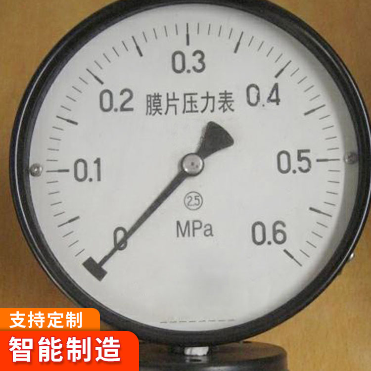 YPF膜片压力表适用于测量具有一定腐蚀性、非凝固或非结晶的各种流体介质的压力或负压。膜片式压力表由膜片部件,机芯部件,指针部件及外壳连接部件四大部分组成。YPF膜片压力表是膜片作为仪表的强性元件,当被测介质的压力作用到膜片上,膜片产生一个位移,再经过机芯部件,指针部件的工作,使要测的压力清楚地在刻度盘上指示出来。