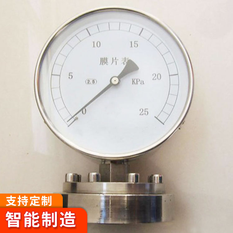 YPF膜片压力表由测量系统(包括法兰接头、波纹膜片)、传动指示机构(包括连杆、齿轮传动机构、指针和度盘)和外壳(包括表壳和罩圈)等组成。