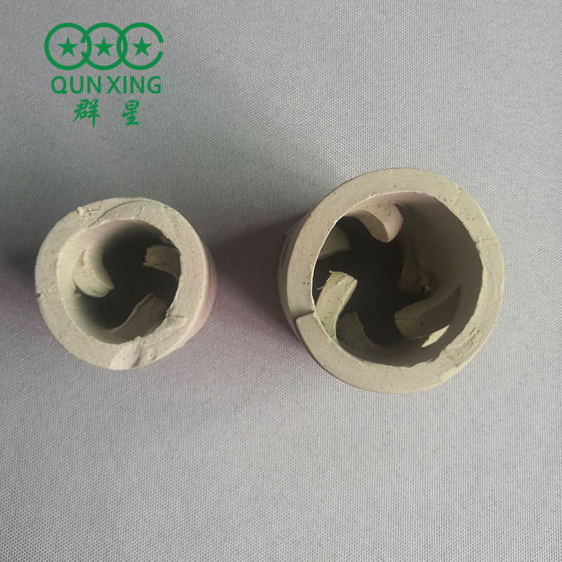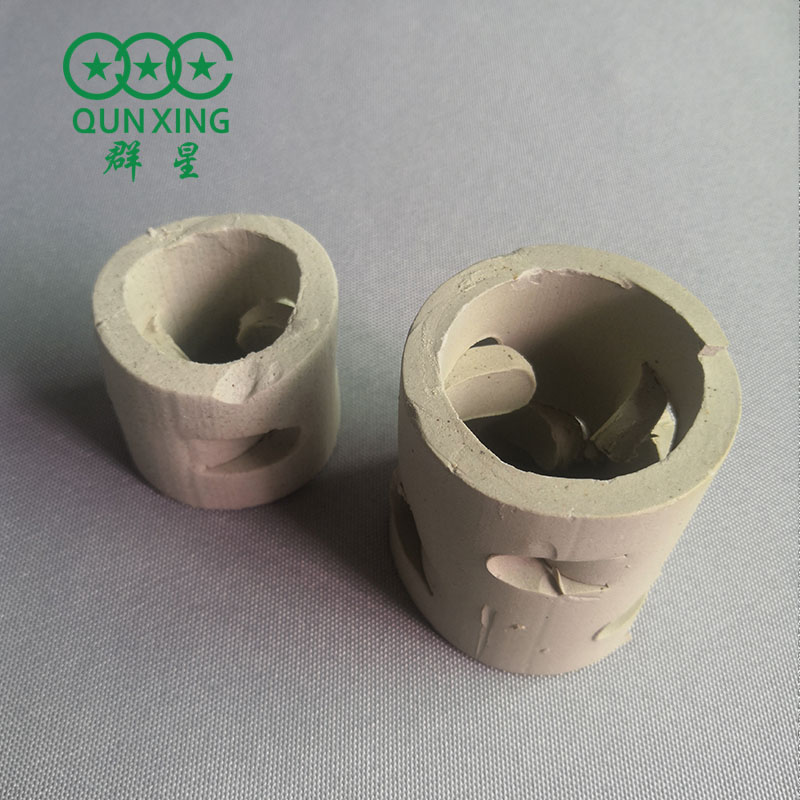 陶瓷鲍尔环填料是在陶瓷拉西环的基础上开发的一种高径相等的开孔环型填料,每层窗孔有5个舌叶,每个舌叶内弯指向环心,上下两层窗孔的位置相反错开,一般开孔面积约占环壁总面积的30%左右,使得填料塔内的气体和液体能够从窗孔自由通过,改善了气液分布,充分利用了环的内表面。