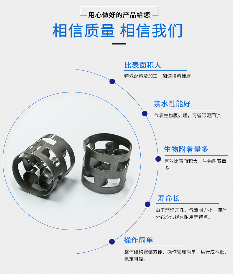 公司生产的金属鲍尔环特点:鲍尔环填料具有低压降,通量大,效率高的特点。HYPAK填料较同类尺寸的PALL环具有更低的压降及更高的传质效率,而且在填料层内液体分布好。
