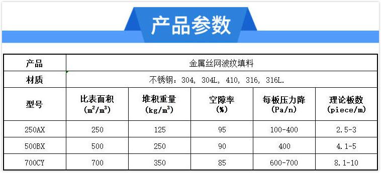 金属丝网填料是目前世界各国应用比较广泛的高效填料,它是由若干平行直列的金属波纹网片排列组成的圆盘状填料。它具有比表面积大、孔隙率大、重量轻;气相通路倾角小、有规则、压降低;径向扩散良好、气体接触充分等特点。