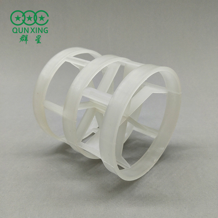 聚丙烯鲍尔环填料是一种高径相等的开孔环型填料,每层窗孔有5个舌叶,每个舌叶内弯指向环心,上下两层窗孔的位置相反错开,一般开孔面积约占环壁总面积的30%左右。具有空隙率大,压降和传质单元高度低,泛点高、汽液接触充分、比重小、传质效率高等特点。这种结构改善了汽液分布,充分利用了环的内表面,从而使得填料塔内的气体和液体能够从窗体自由通过。