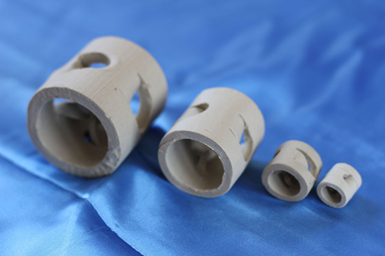 陶瓷鲍尔环填料是在陶瓷拉西环的基础上开发的一种高径相等的开孔环型填料,每层窗孔有5个舌叶,每个舌叶内弯指向环心,上下两层窗孔的位置相反错开,一般开孔面积约占环壁总面积的30%左右,使得填料塔内的气体和液体能够从窗孔自由通过,改善了气液分布,充分利用了环的内表面。