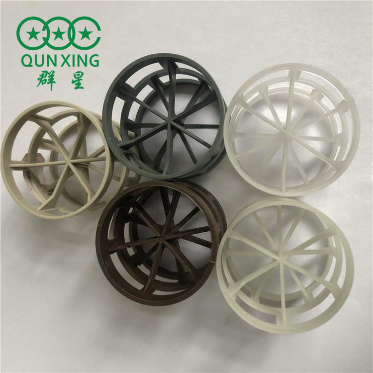 聚丙稀又分普通性(使用高温度+80℃和增强性(使用高温度+120>℃)二种。水冷塔可选用普通型聚丙稀鲍尔环填料;空冷塔在启动时,空压机如不设置未端冷却器,启动时的空气温度约为90℃,因此选择增强型鲍尔环填料或者大部分选择普通型聚丙稀鲍尔环填料,在填料底层约2m高应选择不锈钢鲍尔环填料,以防聚丙稀鲍尔环填料热变形抗压强度的降低。