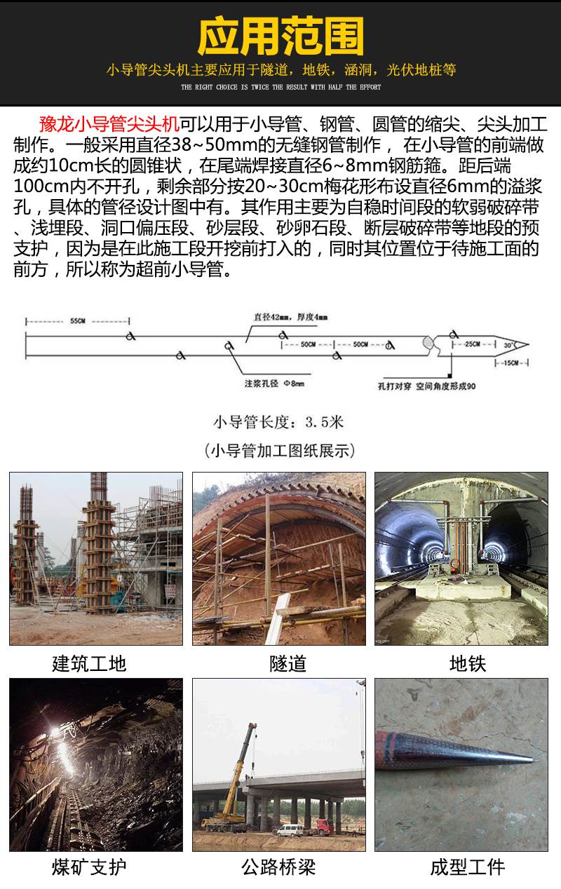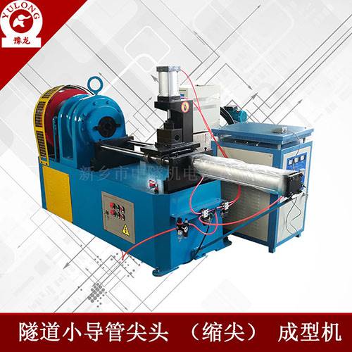豫龙小导管尖头机可以用于小导管、钢管、圆管的缩尖、尖头加工制作。一般采用直径38~50mm的无缝钢管制作, 在小导管的前端做成约10cm长的圆锥状,在尾端焊接直径6~8mm钢筋箍。距后端100cm内不开孔,剩余部分按20~30cm梅花形布设直径6mm的溢浆孔,具体的管径设计图中有。其作用主要为自稳时间段的软弱破碎带、浅埋段、偏压段、砂层段、砂卵石段、断层破碎带等地段的预支护,因为是在此施工段开挖前打入的,同时其位置位于待施工面的前方,所以称为超前小导管。