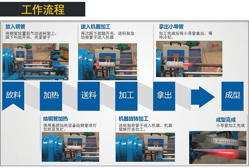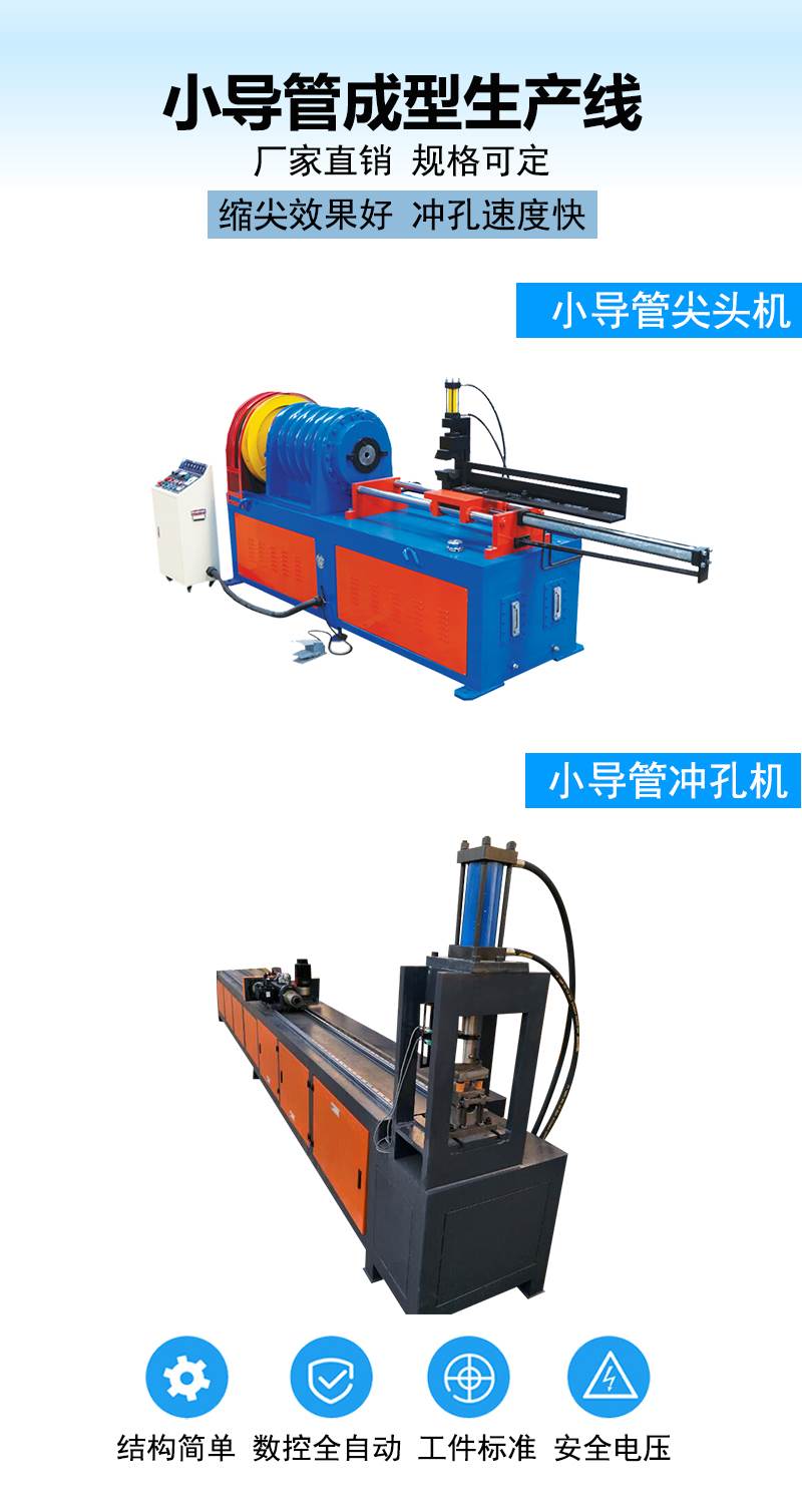 小导管尖头机加工的小导管,统一,符合技术件成型时间短,效率高,外形美观无伤痕,实则件件精品,实乃企业生产之良器,配合豫龙YL80CNC小导管冲孔机及加热设备可以达到,使企业省时省力。