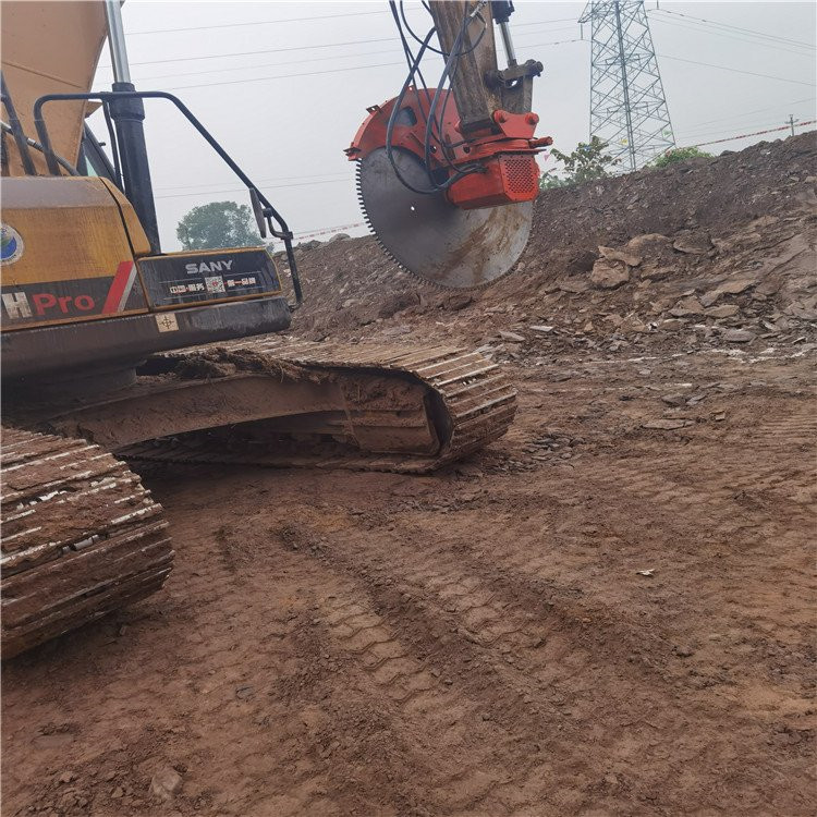 挖机改装岩石切割锯,可加装360度旋转,平切,竖切,切割钢筋混凝土支撑梁,速度在10米/小时,切割坚硬花岗岩在10米/小时,切割石灰岩在15米每小时,切割深度根据挖机型号定制,从0.1-2米切割深度均可安装定制。