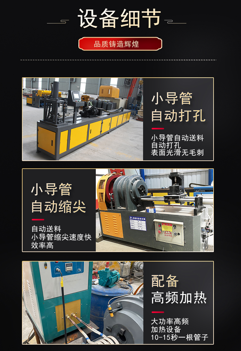 5、机械的耐用性:直接取决于零部件的公差精度要求,公司对零部件的严格检测及对装配工艺的精益求精能切实有效保障产品的耐用性,物超所值!小导管成型机