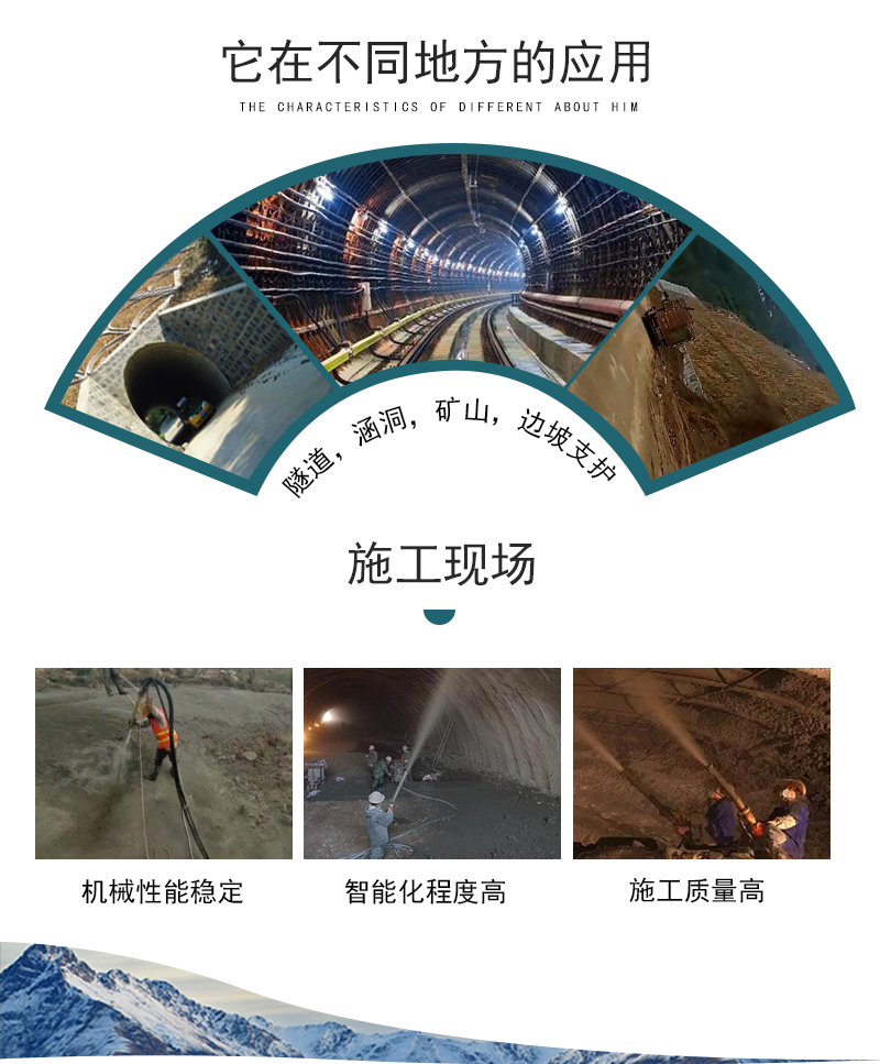 豫龙液压湿喷机主要由驱动装置,转子总成,风路系统,喷射系统,电气控制箱等部分组成。豫龙液压湿喷机的工作原理:搅拌好的物料由配料搅拌机卸料口经过振动筛网供入液压湿喷机料斗中,由拨料器拨动注入转子体通料腔中,随转于旋流到出料口处,在这里从气室通入压缩空气,把物料吹入出料弯头,在此,由旋流器引入另一股压风,呈多头风螺旋状态把物料吹散,加速,并使其旋转,浮游,进入输料管,到达喷头再添加少量补充水分或液体速凝剂喷射出去。