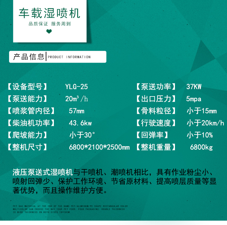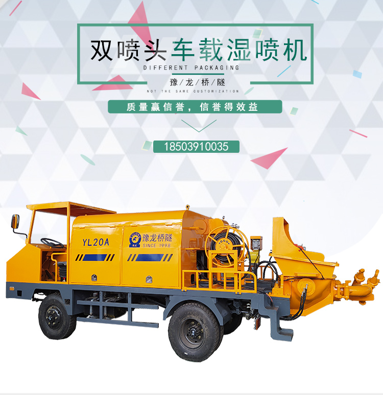 液压湿喷机广泛用于矿山、隧道、涵洞、地铁、水电工程,地下工程及煤炭高沼矿井巷道喷射混凝土施工作业;各种墙体加固喷射细石混凝土;各种类工业炉窑,炉衬的耐火材料喷涂成型或修补;各种护坡绿化施工中,土壤的输送和喷射。,也可以用于干喷及个类纤维喷射作业。其主要特点和优势在于:直通转子式不粘结料腔,出料通畅,高效省时:四点弹性补偿压紧,密封效果好,机旁粉尘少,易损件寿命长:采用低压高速涡旋气流输送,克服物料输送中粘结,堵管和脉冲离折等问题,料流均匀,连续稳定:新型喷头,出料弯头装置,改善喷敷效果,回弹少,喷层质量高。