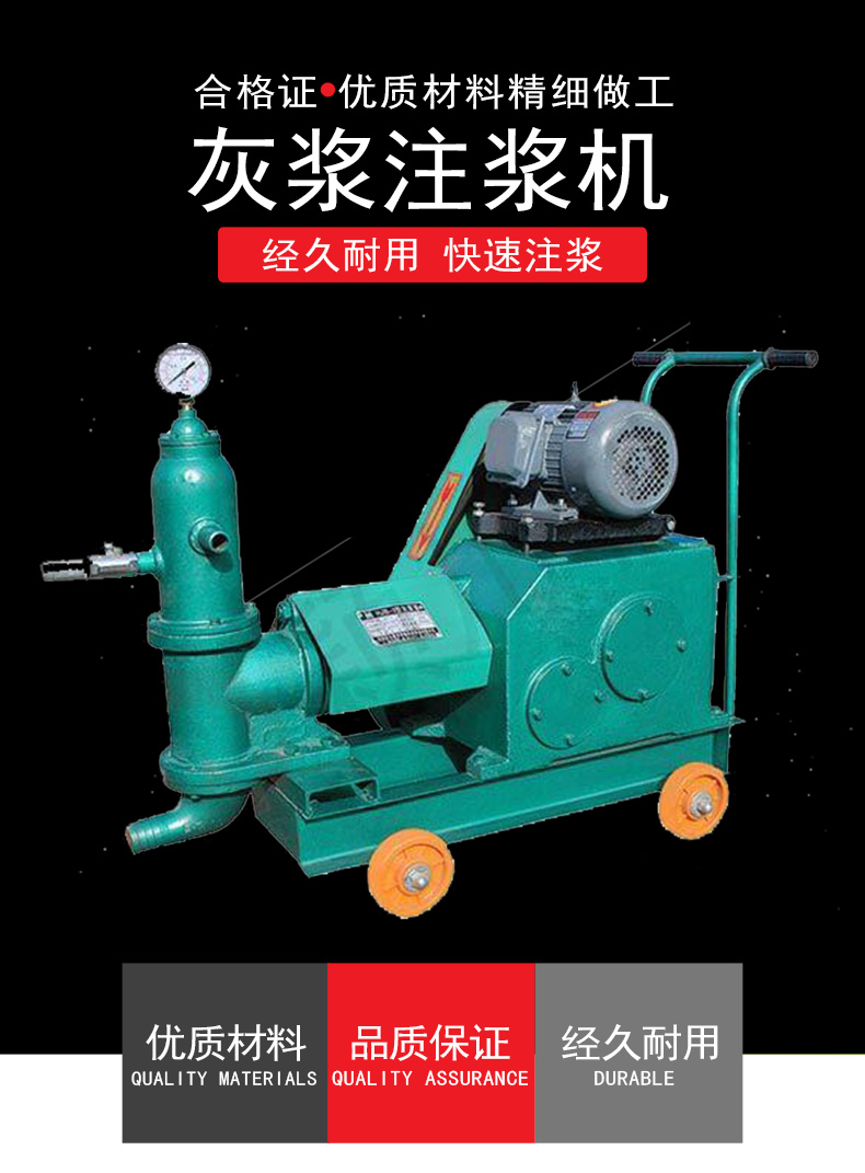 单缸活塞式注浆泵又称为单缸灰浆泵,单缸活塞泵。单缸活塞式注浆泵由传动机构和泵体两部分组成,由三角皮带及一对齿轮将电动机回转运动传递至曲轴,再通过连杆、十字-t使活塞产生往复运动,齿轮箱为封闭式,采用飞溅润滑各运动部分。灰浆由吸入阀经泵缸压送至空气室排出,在空气室上装有泄浆阀及压力装置,单缸活塞式注浆泵采用了电器自动控制装置。