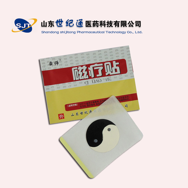 山东世纪通医药科技有限公司承接膏药贴牌加工,黑膏药加工生产。磁疗贴是山东世纪通生产的经备案的二类医疗器械文号的产品,其特点是太极八卦的黑白膏药,两片膏药上有远红外磁片能源源不断的提供远红外线,磁热治疗贴是将磁片、远红外布导热胶层和发热体相组合,治疗时具有磁疗和热疗的作用。通过磁场、远红外线和热量作用于体表相应穴位、神经节段或痛点产生治疗作用,改善微循环,达到疏通经络、化瘀、解挛舒筋、调节神经反射、镇痛消炎、促进康复等目的。本产品现,提供贴牌加工,价格优惠,欢迎来电咨询。磁疗贴可以贴6~8个小时左右。但是具体可以贴多长时间,还要根据磁疗贴的品牌和使用效果来决定。磁疗贴在身体上会产生发热的感觉,通常没有发热现象就证明已经失去作用。主要的功效与作用可以有效的改善微循环,增强机体细胞的活力,并且能够加强身体的代谢作用,因此生活中就可以适当使用磁疗贴来改善身体中的微循环。